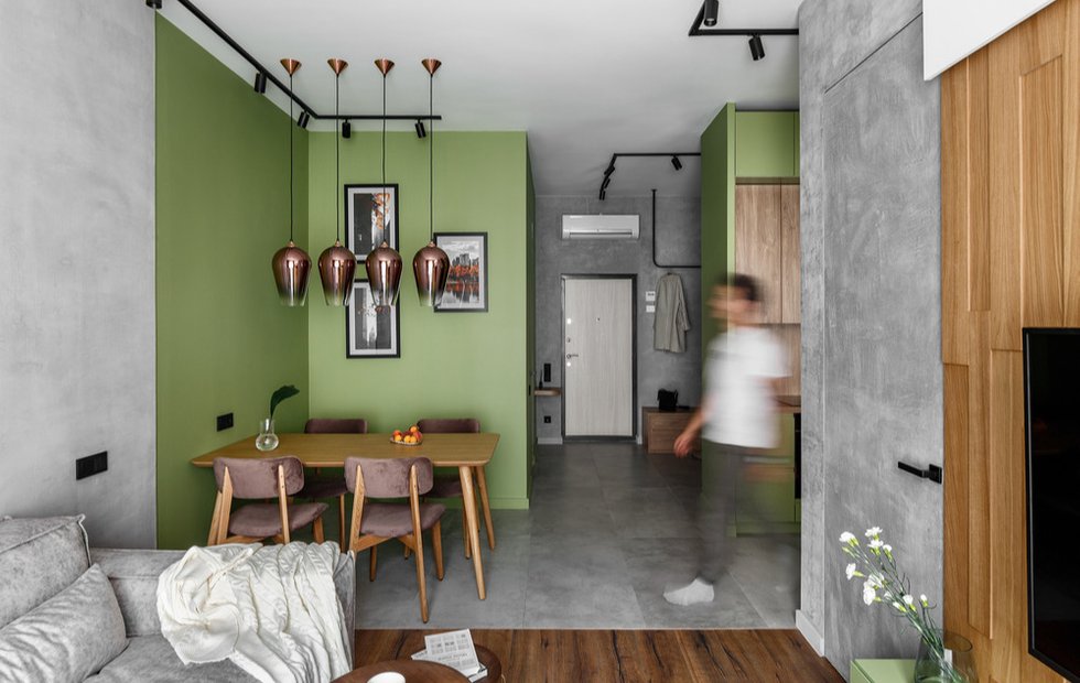 Дизайнеры из Istok Bureau оформили однокомнатную квартиру под сдачу в аренду, используя качественные натуральные материалы и природные оттенки. Для стен выбрали три материала. Декоративная штукатурка под бетон придает помещению некоторую брутальность. Панно из дерева, деревянные элементы в кухне контрастируют с бетонной штукатуркой и делают пространство более уютным.