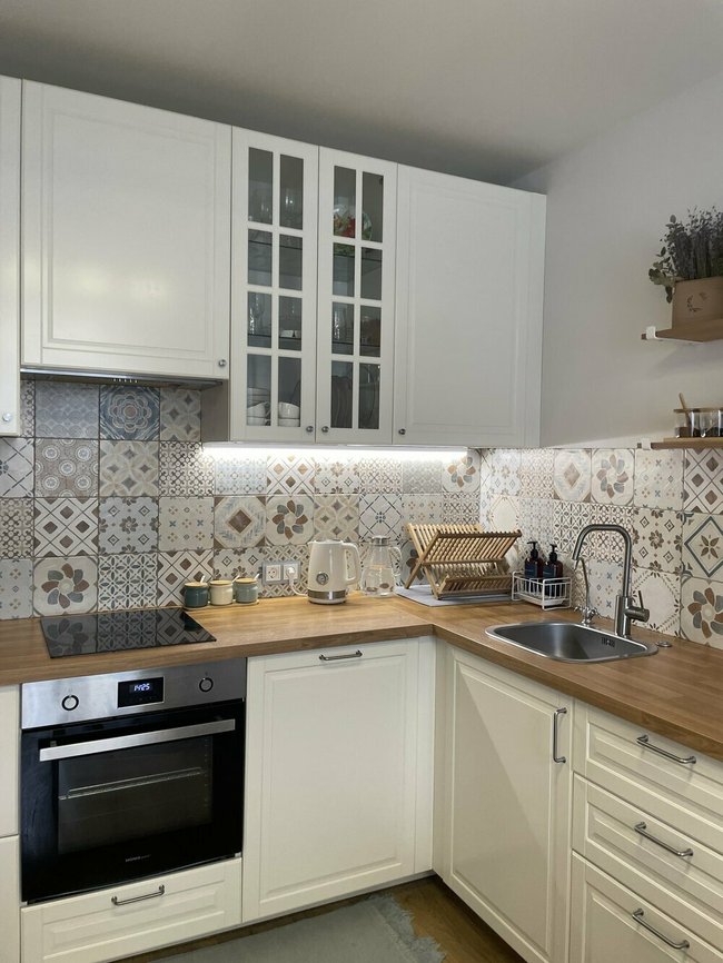 В своей квартире Ольга продумала до мелочей выбор материалов, мебели, хранение и эргономику. Многое делали с мужем своими руками, например, увеличили количество розеток, добавили подсветку для кухонного гарнитура и декорировали мебель, которая не сочеталась по стилю.