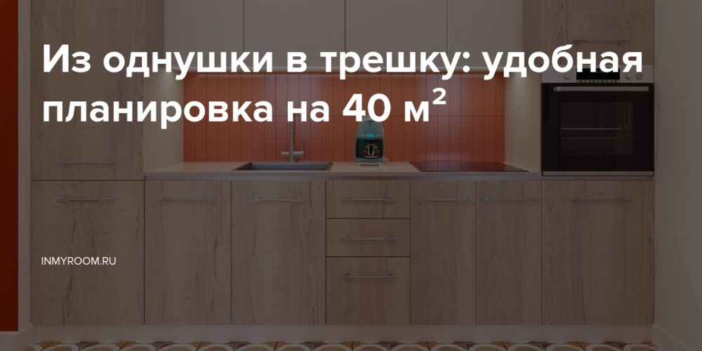 Чтобы организовать пространство и разместить на скромной площади много функциональных зон, кухонный гарнитур перенесли на место коридора — это законно. Прихожая получилась совсем маленькая, а обеденная зона проходная, зато теперь на 40 квадратах есть три комнаты. В спальне выделили гардеробную. А вторую комнату разделили на две с помощью перегородки с раздвижной дверью.