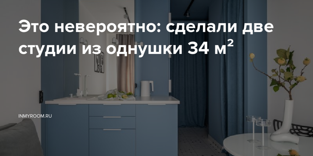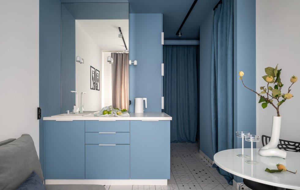Ника Чередникова оформила для заказчика 34 кв. м: необходимо было создать две полноценные студии и разместить на крошечном метраже две кухни-гостиные, два санузла, общую прихожую с постирочной и вместительные места хранения. В результате перепланировки жилая площадь каждой студии составила по 13 кв. м. А бюджет был всего 2 млн рублей.