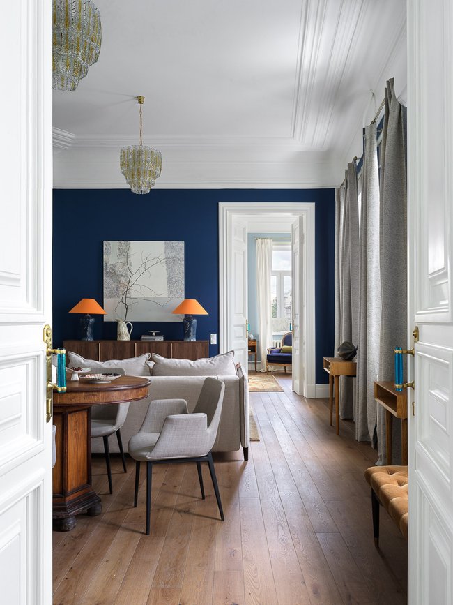 Эта необычная двушка находится в бывшем доходном доме К. А. Колесова, который был построен в начале XIX века — в 1808 году. Дизайнеру Ольге Комаровой удалось отреставрировать квартиру с анфиладной планировкой, сохранить печи, лепнину и двери. Кухню сделали максимально незаметной и вписали в интерьер исторической гостиной.