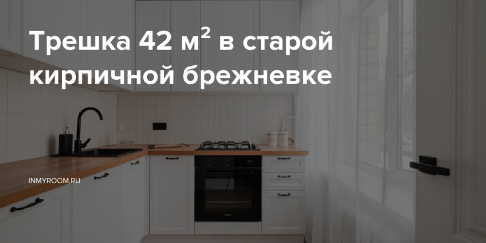 Площадь кухни всего 5,5 кв. м. Чтобы разместить угловой гарнитур, дверь в кухню перенесли, теперь она находится со стороны гостиной. Наполнение квартиры ориентировано на полноценную семью, поэтому предусмотрели большое количество шкафов, четырехконфорочную варочную поверхность, духовку, посудомоечную машину и отдельностоящий холодильник. Столешница из ЛДСП с ровным краем, за счет которого материал выглядит презентабельно. На светлой кухне черными графичными акцентами выступают холодильник, раковина со смесителем, розетки и ручки на нижних фасадах шкафчиков.