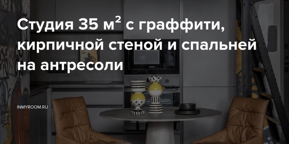 Дизайнер Катрин Диб оформила крошечную квартиру 35 кв. м для студента, предусмотрела максимум хранения и функционала. Из-за сжатых сроков ремонта остановились на лофтовой стилистике, сохранили кирпичную стену, бетонный потолок и открытую проводку. Спальню сделали на антресоли, а мягкую зону для отдыха — на подоконнике. Зашифрованные граффити на стенах кухни и санузла заказчик разрабатывал совместно с художником.