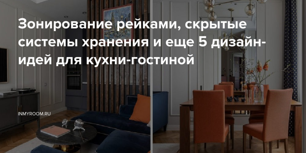 Зонирование рейками преображает любую планировку и делает пространство комнаты более функциональным. Перегородка между кухней и гостиной визуально делит помещение на две зоны, не перегружая его стенами.