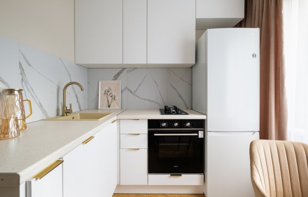Модульные кухни стандартных размеров обходятся намного дешевле, чем заказные позиции, которые всегда увеличивают бюджет и сроки проекта. Для этой кухни выбрали готовый гарнитур со светлыми фасадами. Чтобы не перегружать и без того скромное пространство, верхние шкафчики разместили только на одной стене, что тоже позволило сэкономить.