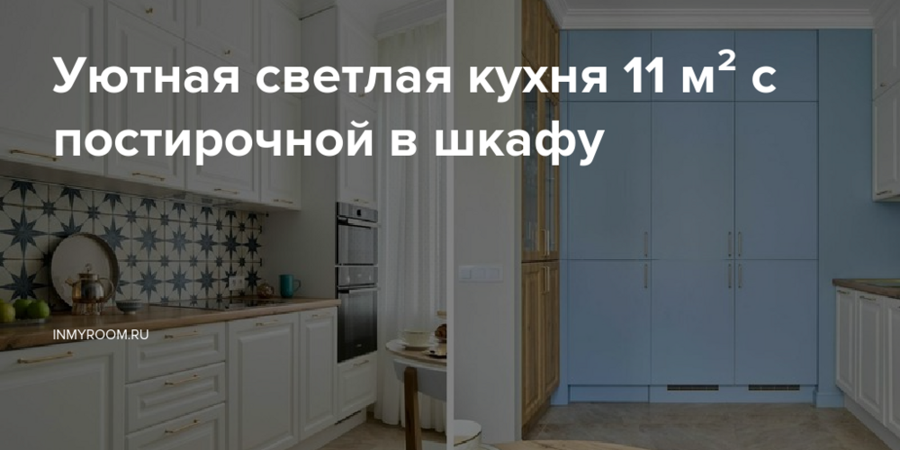Цвет синей звезды на фартуке «разбелили» и оформили уже голубым цветом фасады на смежной с гарнитуром стене. За этими фасадами скрыли холодильник, морозильную камеру и много хранения. А одна дверь ведет в... постирочную (до перепланировки здесь располагался второй санузел). В этом помещении можно не только стирать, но и гладить, хранить принадлежности для уборки и скрыть все, что не должно быть на виду.
