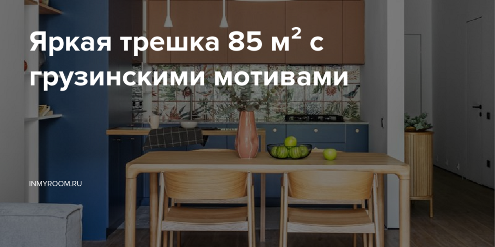 «Отправной точкой проекта стал традиционный грузинский ковер. Цвета интерьера взяты именно с его орнамента, поэтому они так гармонируют друг с другом, — рассказывает дизайнер. — В гостиной расположились два винтажных кресла в стиле мидсенчури (после полной реставрации в местной мастерской). Еще одной интересной деталью кухни-гостиной стала керамическая люстра, изготовленная на заказ в мастерской и расписанная вручную местным художником».