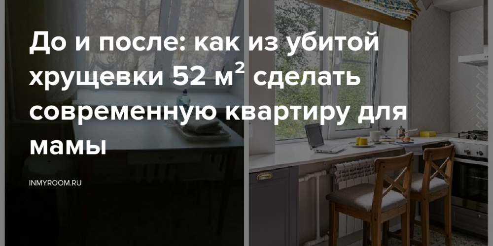 Дизайнер Лана Александрова превратила старую двухкомнатную хрущевку 1958 года постройки в современное и уютное пространство для своей мамы. Квартира находится в пригороде Санкт-Петербурга, в городе Пушкин. Это индивидуальная серия хрущевки с нестандартной планировкой — общая площадь 52,9 квадратных метров, из них кухня 7 квадратных метров, что больше, чем в обычных хрущевках. Особенность планировки — комнаты выходят на две стороны, а в квартире есть два балкона.