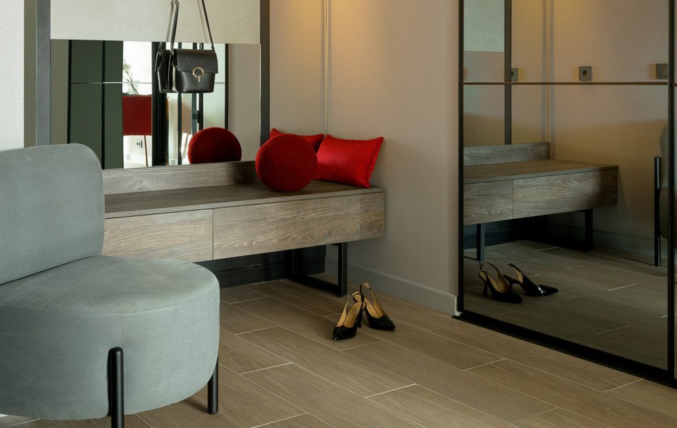 - Теплый пол в коридоре — комфортное решение, особенно если здесь раздеваются и разуваются.