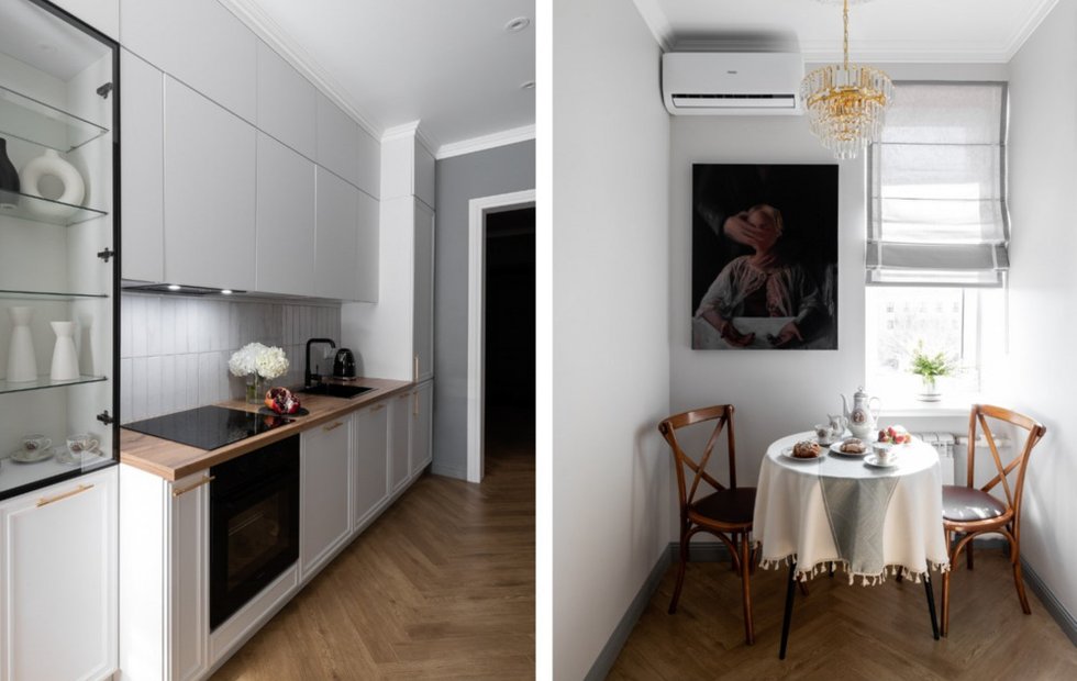 Кухня сохранила свои прежние размеры и границы. Гарнитур был изготовлен на заказ, и, несмотря на ограниченный бюджет, удалось создать достаточно вместительное и функциональное пространство. В кухне предусмотрены места для встроенной техники, а также витрина для праздничной посуды. Это позволяет удобно организовать хранение и добавляет стильный элемент в интерьер.