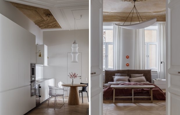 Вместо того чтобы закрасить старые гипсовые элементы, дизайнер сохранила их фактуру: где-то покрыли грунтом, где-то обработали воском. Благодаря этому лепнина осталась живой, с естественными неровностями и трещинками. Ход позволяет подчеркнуть историю и добавить индивидуальности.