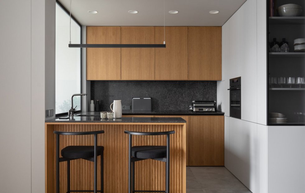 В гостиной использовали много дерева, схожего по оттенку, но все же отличающегося — это придало ощущение естественности. Различные оттенки зеленого воспринимаются как листва, в зоне возле большого окна в пол и на кухонной столешнице используются материалы, отсылающие к камню.