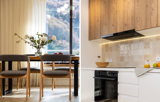 Дизайнер Анна Терентьева создала интерьер квартиры для молодой семьи, вдохновившись окружающими красотами Красной Поляны. Главный акцент сделан на кухне, откуда открывается потрясающий панорамный вид на горы. Здесь интерьер словно растворяется в природе: натуральные материалы и оттенки поддерживают атмосферу гармонии.