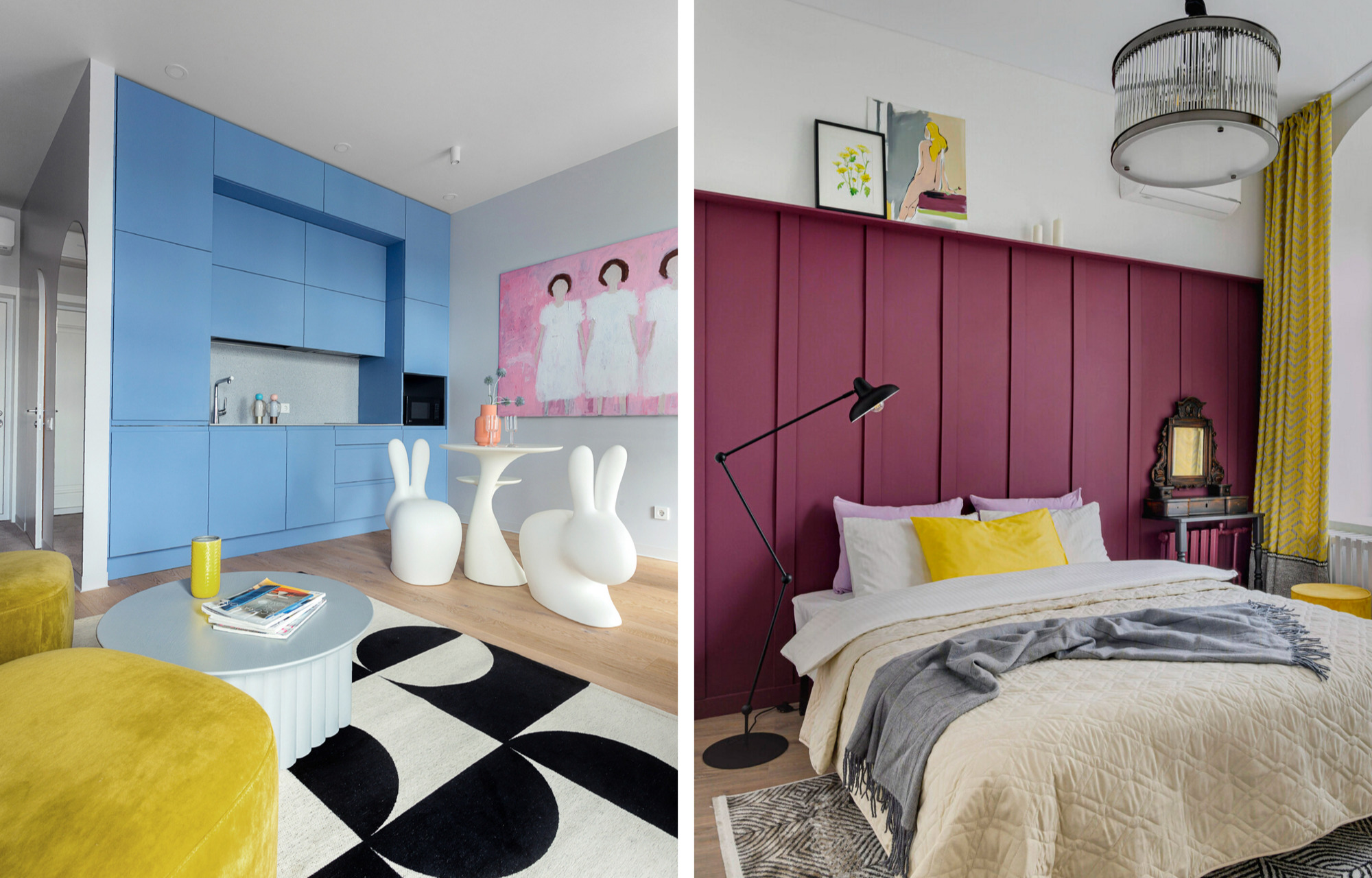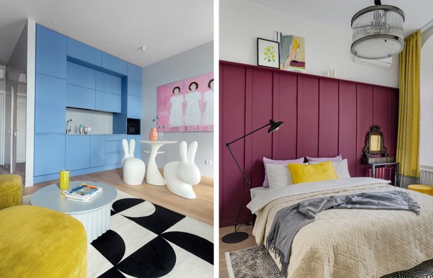 Мебель и декор подобрали тоже с характером: голубой кухонный гарнитур, ярко-желтые кресла и стеллаж, картины в одной тематике — все в поддержку смелых цветовых решений. Для выразительности в кухне-гостиной постелили ковер с графичным рисунком. А чтобы в спальне создать атмосферу гармонии, в ней предусмотрели только самое необходимое: уютную кровать, застеленную красивым фактурным текстилем, аккуратные оригинальные прикроватные столики и небольшой шкаф для хранения вещей.