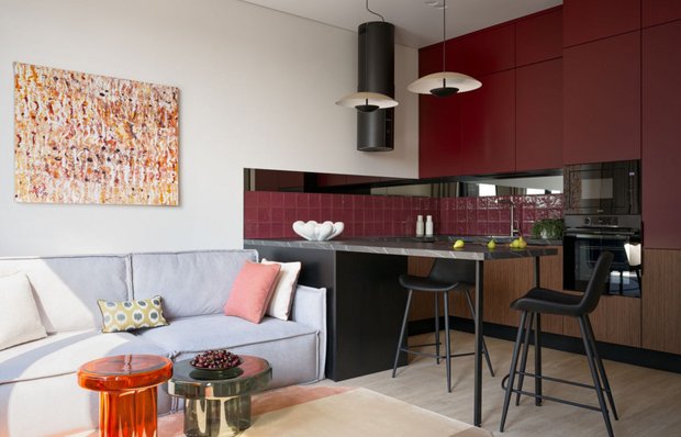 Вся квартира выдержана в единой цветовой гамме, где акцент сделан на трендовые оттенки терракота и бордо. Эти цвета гармонично дополняются графическими черными элементами, такими как электрика и вытяжка, создавая стильный и современный вид.