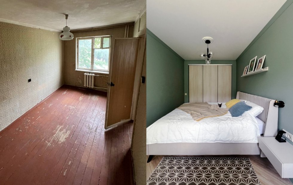 Для спальни выбрали серо-бирюзовый приглушенный оттенок — сложносочиненный цвет, который создает спокойную атмосферу. Стены под покраску, как и во всей квартире.