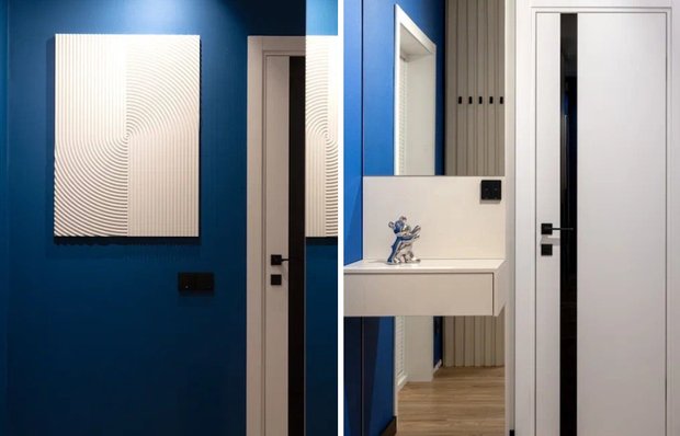 В прихожей организована функциональная зона с вместительными шкафами и зеркальными поверхностями, которые визуально расширяют пространство. Ярко-синие стены подчеркивают глубину интерьера и делают его запоминающимся, при этом они отлично гармонируют с белыми дверями и светлыми деревянными полами.