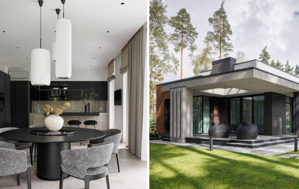 Фасадные решения и внутренняя отделка максимально единообразны. Внутри дома, как и снаружи, основной объем стен выполнен в светло-сером оттенке, который служит фоном. Акцентом выступает черная мебель из красивого матового дерева, на которой приятно остановить взгляд.