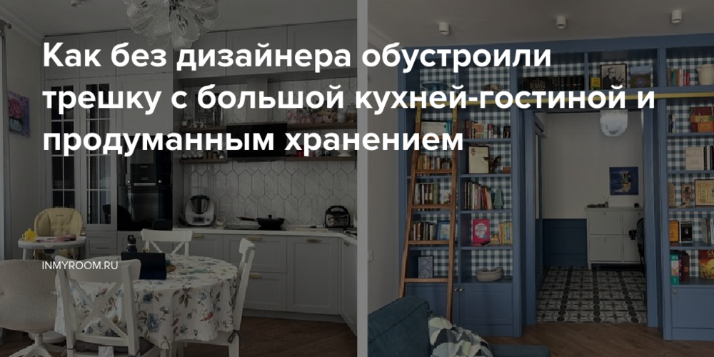 Книжная стенка стала яркой фишкой гостиной. Ее стенки оклеены динамичными обоями в яркую клетку, что придает интерьеру уникальность. Лестница может двигаться по рейлу, облегчая доступ к книгам и другим предметам. А ковер в гостиной — это тот самый, по которому супруг бегал маленьким 35 лет назад.