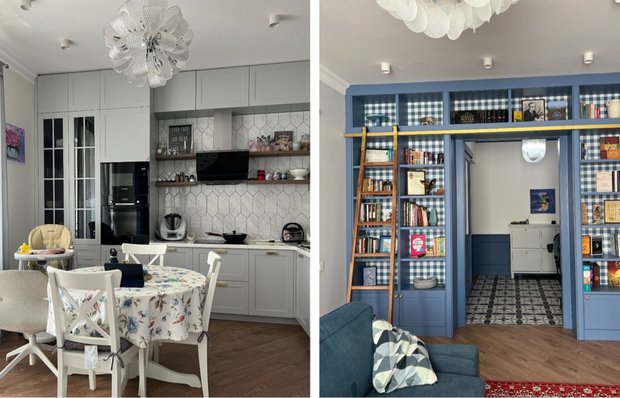 Для отделки стен использовали обои под краску, а в зоне ТВ стену оформили фреской с облаками. Между кухней и гостиной установили раздвижную стеклянную перегородку акцентного синего цвета. Этот цвет перекликается с обивкой дивана и книжной стенкой, которая обрамляет дверной проем и оснащена лесенкой.