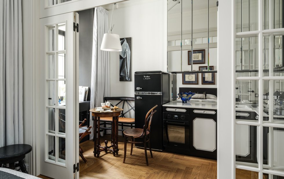 Кухня компактная, но благодаря продуманным решениям она кажется более просторной. Стены и потолок оформлены в белом цвете, а контрастные темные элементы в отделке и гарнитуре добавляют глубину и стиль. Зеркальные верхние фасады мебели и зеркальный фартук отражают свет от окон, наполняя помещение воздухом. Холодильник выполнен в стиле ретро, а около окна разместили антикварный стол и стулья.