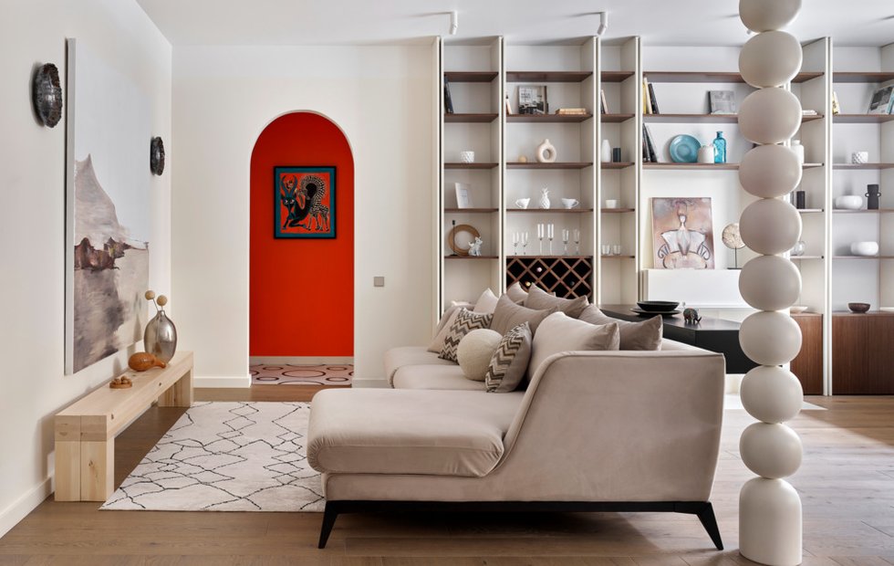 Основным акцентом гостиного зала стала арка, ведущая в приватные зоны. Ее цвет называется «радостный оранжевый» — он создает эффект светящегося арт-объекта. Этот цвет повторяется и в гостевом санузле, где одна из стен окрашена в тот же тон.