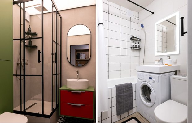 Для отделки стен санузла в этой двухкомнатной хрущевке выбрана белая плитка. Черная затирка в зоне ванны создает интересный контраст. Раковина, установленная над стиральной машиной, существенно экономит пространство. В ванной добавлены функциональные полочки для гелей и шампуней. Сушилка, удобная как в собранном, так и в разложенном виде, позволяет эффективно использовать пространство для полотенец и белья. Зеркало над раковиной с аккуратной подсветкой создает мягкое освещение и визуально расширяет комнату. Завершает образ стильная шторка, гармонирующая с общим дизайном.