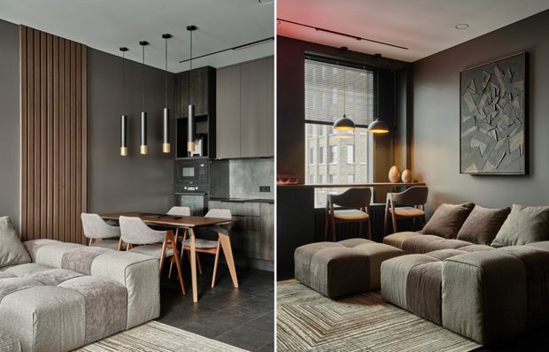 Гостиная разделена на функциональные зоны: кухонную, ТВ и лаунж-зону. Каждая из них подчеркнута различными цветовыми решениями и отделками, что позволяет максимально эффективно использовать пространство, сохраняя при этом ощущение свободы.