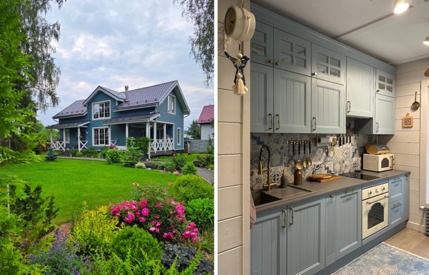 Дом мы строили по каркасной технологии, и это сэкономило много времени — мы уложились всего в полтора месяца! Главной задачей было создать уютный и просторный интерьер, а еще обязательно предусмотреть открытую террасу для комфортного отдыха. Я всегда мечтала о голубом доме, и этот цвет стал основным не только снаружи, но и внутри.