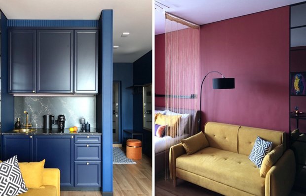 Чтобы визуально отделить кухню от гостиной, использовали зеркальные панели с графическим черным оформлением. Яркий желтый диван в гостиной раскладывается и превращается в дополнительное спальное место. Напротив него расположена столовая зона.