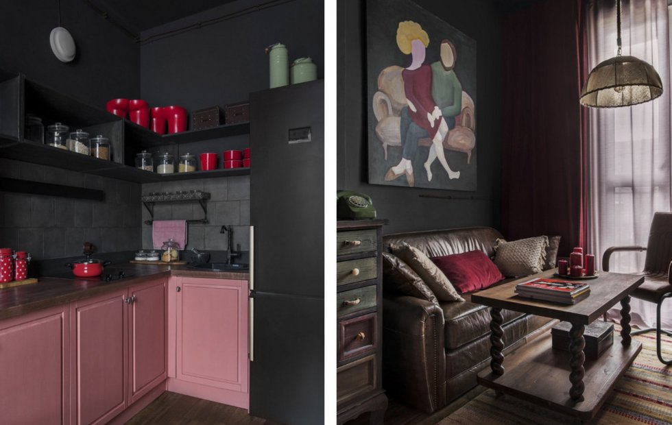 «Конечно, планировка моей квартиры — нестандартна, здесь много винтажных элементов, розовая кухня и графитовые стены, — делится дизайнер. — Можно сказать, что я разрушаю стереотипы: рассказываю знакомым, что в квартире полностью черные стены и потолки, и они сначала приходят в ужас. Но, оказавшись у меня в гостях, все удивляются, как здесь уютно и тепло, совсем не мрачно».