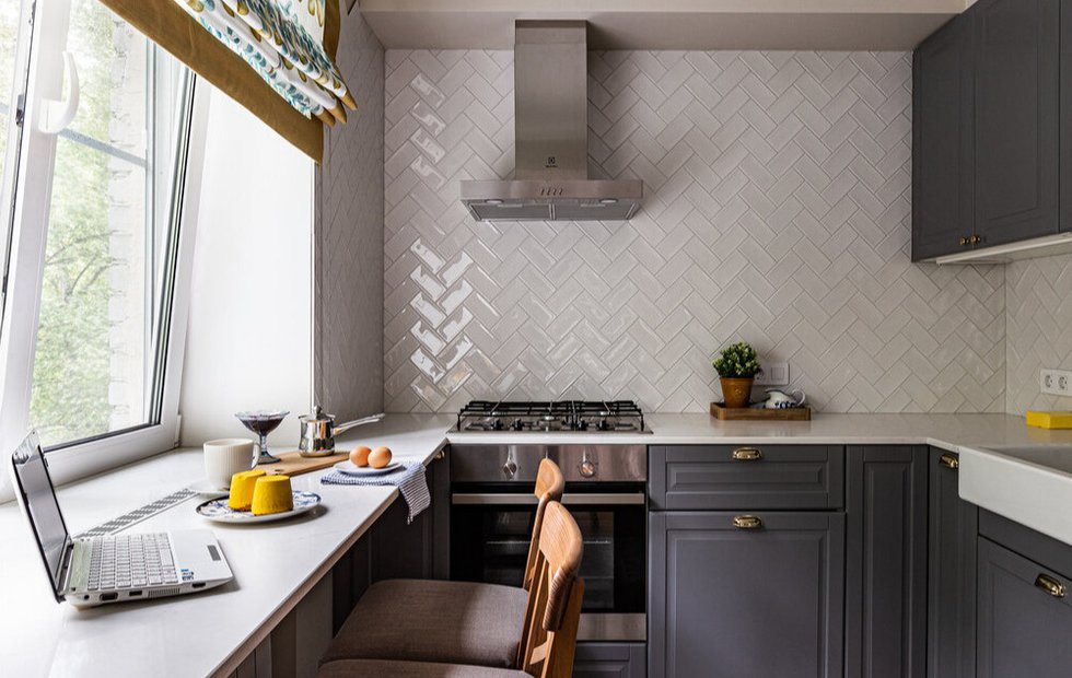 В хрущевках подоконник обычно используется для цветов или как склад для банок. Дизайнеры превращают его в продолжение рабочей поверхности — заказывают столешницу, которая перетекает на подоконник. Это добавляет 40-50 см рабочей зоны, а если сделать откидную часть — еще и обеденный стол для двоих.