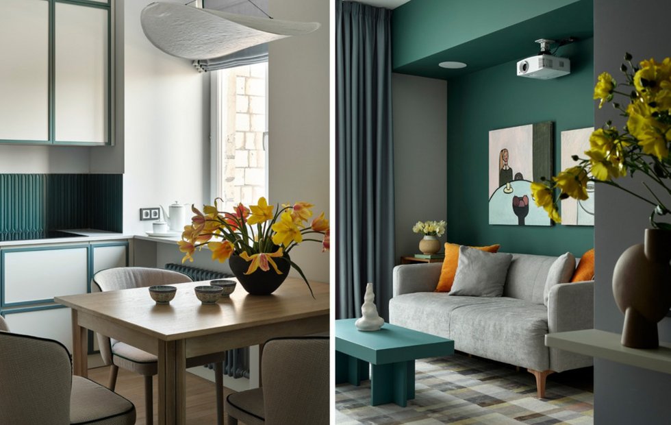 Зону кухни расширили за счет гостиной, что позволило разместить угловой кухонный гарнитур со шкафами-колоннами, в которые встрона вся необходимая техника. Это освободило место для рабочей поверхности. Белые фасады кухни аккуратно обрамлены изумрудными контурами, а цвет фартука подбирали под этот оттенок. Рабочую поверхность увеличили, соединив ее с глубоким подоконником.