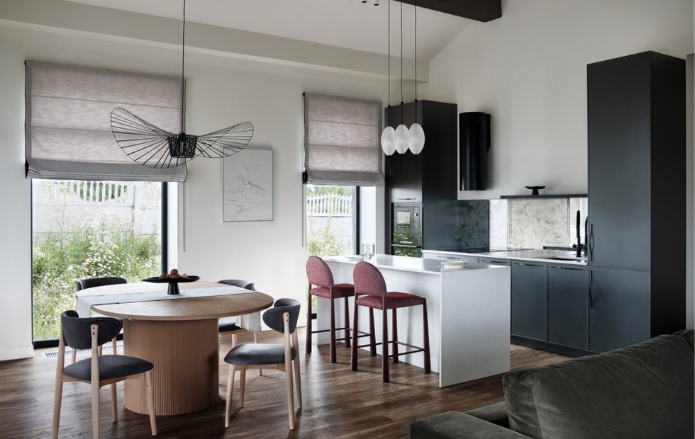 Просторная кухня-гостиная с высокими потолками стала центральным пространством дома. Здесь проходят семейные ужины и теплые встречи с друзьями. Большие окна наполняют комнату дневным светом, визуально соединяя интерьер с окружающей природой. Диван глубокого зеленого оттенка отсылает к цветам хвои и сочной травы за окном.