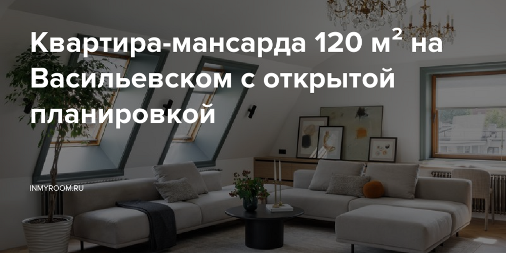 Квартира расположена на Васильевском острове в здании, построенном в 2001 году, среди старых домов. У дома есть внутренний двор и мансардная крыша. Из окон открывается вид на крыши Васильевского острова. Потолки в квартире высокие: 3 метра, в районе конька — 5,3 метра. Планировка открытая: кухня-гостиная, две спальни (одна из них мастер-спальня с ванной комнатой), входная зона и еще один санузел.