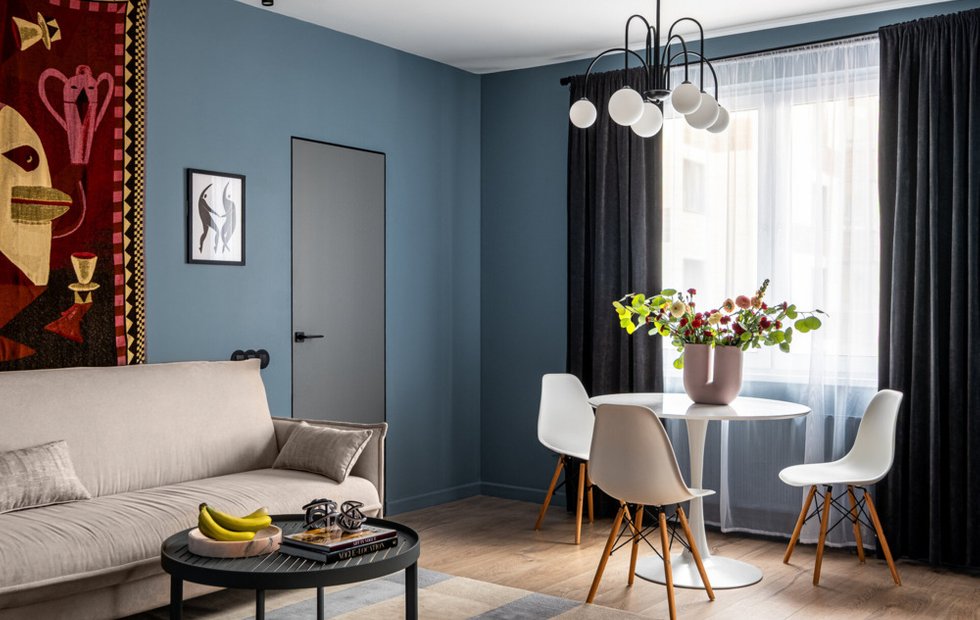 Цвет появляется не на всех стенах, а на одной акцентной. Или на мебели: цветной диван, яркие кресла. Или в текстиле: шторы, подушки, ковер.