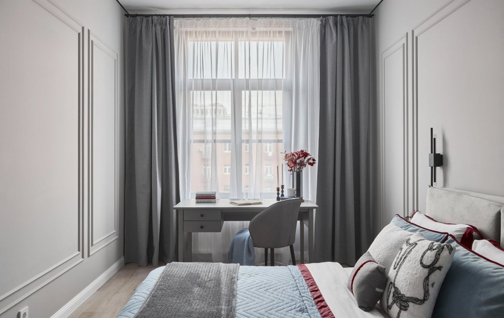 Если кровать стоит не вплотную к стене, за изголовьем можно поставить узкий стол или консоль. Вы сидите спиной к кровати, лицом к стене или окну. Кровать не видно, она не отвлекает.
