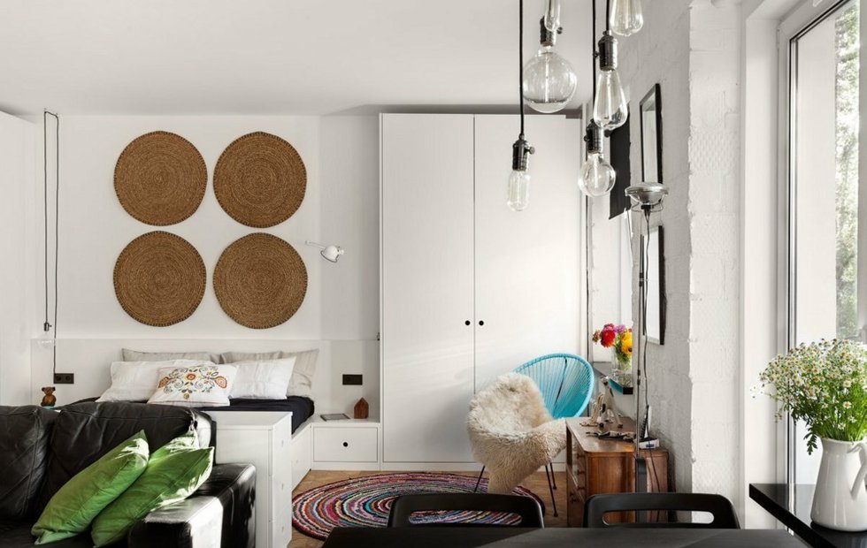 Выбирайте диваны и кресла на низких ножках или вообще без них. Кровать-платформа вместо высокой кровати с изголовьем до середины стены. Журнальный столик высотой 30-40 см вместо стандартных 50-55.