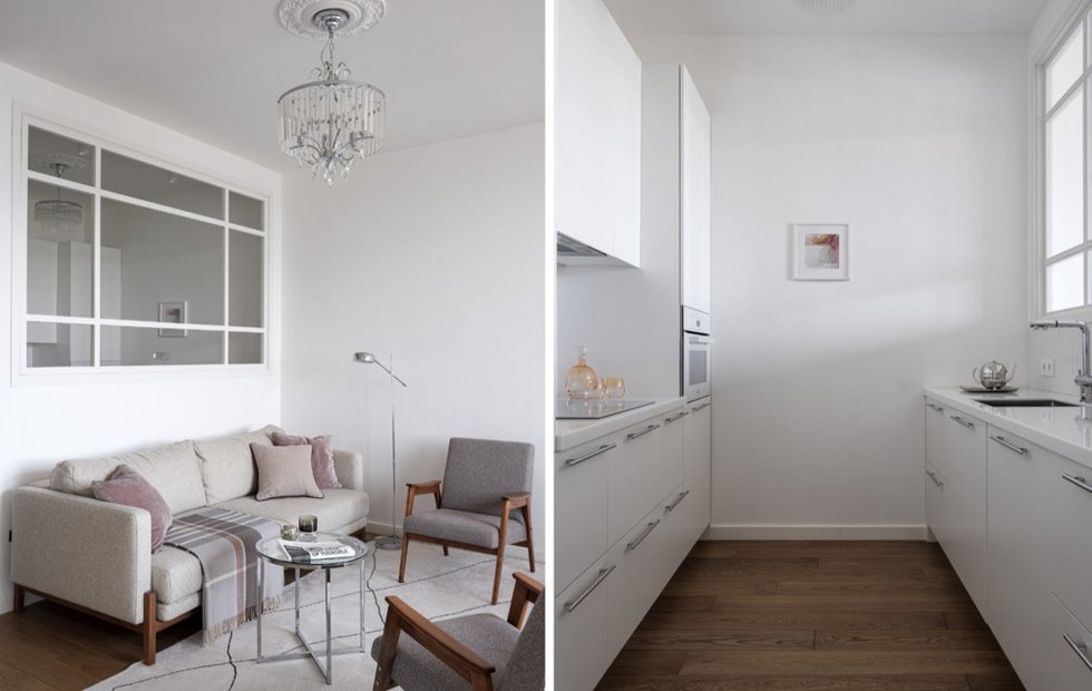 Кухня, несмотря на свои компактные размеры и параллельную конфигурацию, функциональна и удобна. Хозяева готовят здесь нечасто, в основном занимаясь выпечкой и приготовлением десертов. Белые фасады кухонного гарнитура перекликаются с цветом стен, создавая ощущение единого пространства. Столешница и бытовая техника также выдержаны в белой гамме, подчеркивая чистоту линий и минимализм интерьера.