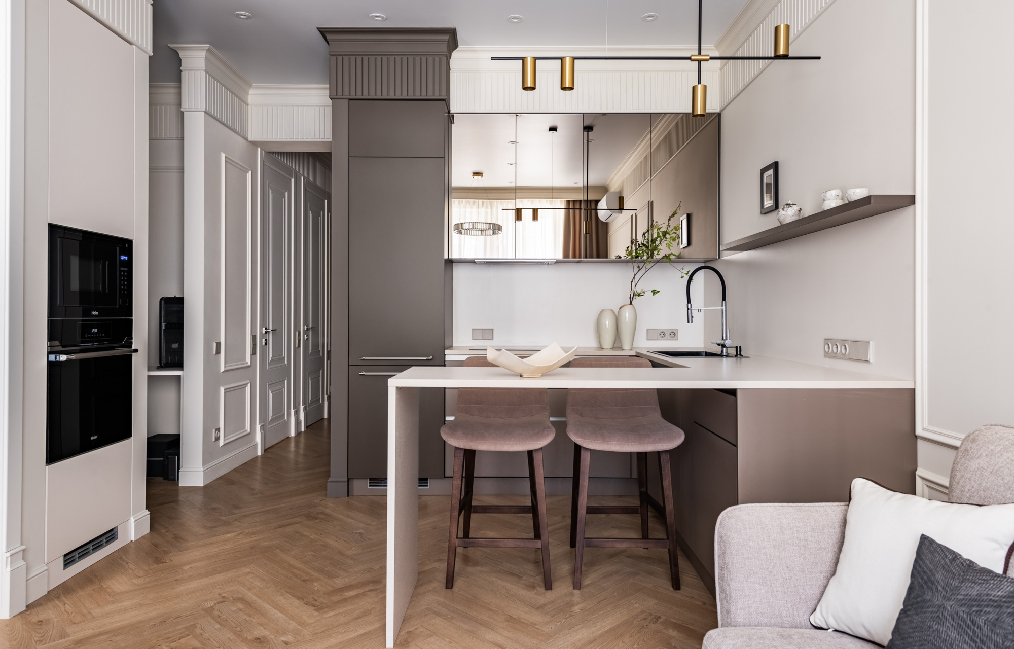 Поскольку заказчица любит готовить, кухню оборудовали всем необходимым. П-образный гарнитур с барной стойкой обеспечивает достаточно рабочей поверхности. Технику разместили в колонне на противоположной стене, что позволило освободить пространство и предусмотреть необходимый функционал. Верхние шкафы установили только на одной стороне, выбрав для них зеркальные фасады, — они отражают свет от окна и визуально увеличивают пространство.