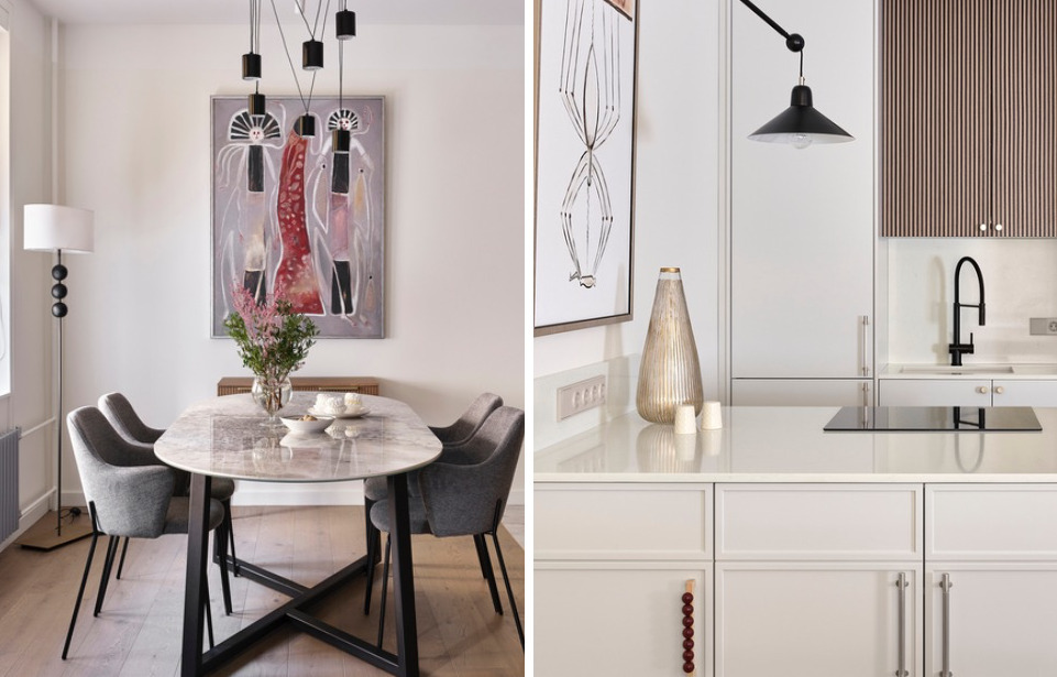 Архитекторы Ирина Фролочкина и Артем Ерыков из студии ProID создали необычный интерьер трехкомнатной сталинки 102 кв. м, где главным мотивом стали шарики. Изначально дизайнеров беспокоила нависающая балка в открытом пространстве: ее решили визуально «подпереть» декоративной колонной из шариков. Круглые формы создают комфортную и располагающую атмосферу, поэтому их повторили в деталях по всей квартире.