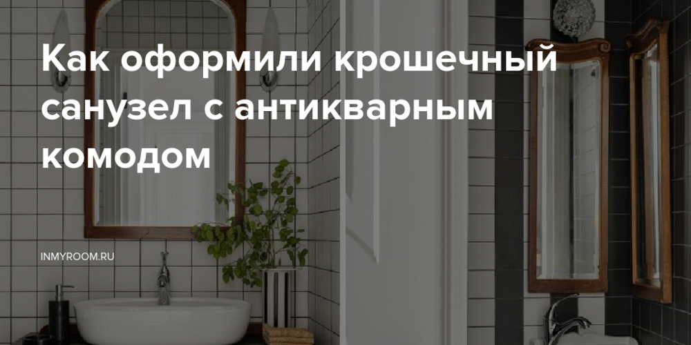 Пол оформили той же керамикой, развернув полосы по диагонали — прием добавил движения и избавил от статики. Роль тумбы досталась старинному деревянному комоду на фигурных ножках — с ящиками, дверцами и круглыми латунными ручками. Поверх положили черную каменную столешницу с матовым финишем, на которой обосновалась овальная накладная раковина, черные диспенсеры и горшок с живой зеленью в полосатом кашпо.