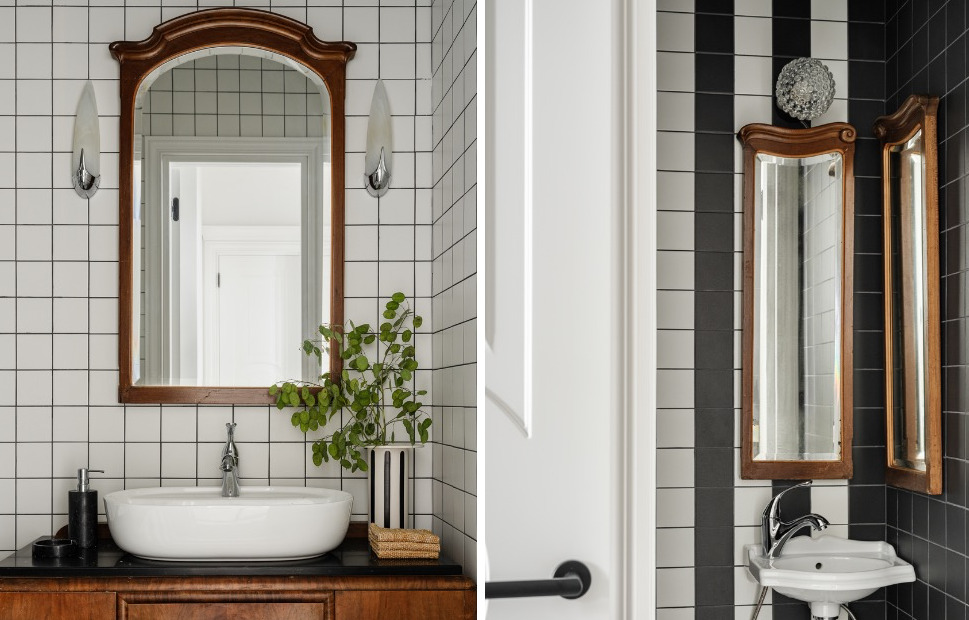 Ванну спрятали в нишу и облицевали теми же черно-белыми полосами, что и душ, связав композицию воедино. Второй санузел решили проще: миниатюрная подвесная раковина, та же полосатая облицовка и пара старинных зеркал в деревянных рамах, выстроенных симметрично.