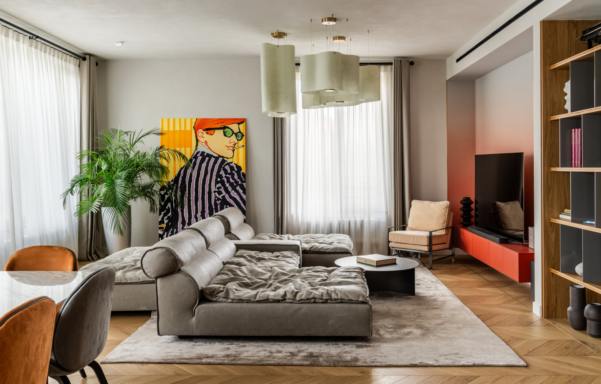 В центре гостиной расположился мягкий диванный остров — большой модульный диван, идеально подходящий для отдыха в большой компании. Ниша в зоне ТВ оформлена с использованием градиента красного цвета, привлекающего внимание.