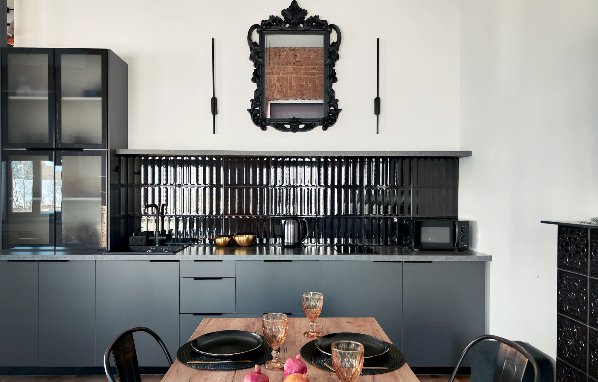 От газоснабжения отказались в пользу электрической варочной панели на две конфорки. Лаконичный кухонный гарнитур состоит только из нижних секций. Вместо верхних шкафов установлена стеклянная витрина и открытая полка, над которой расположено винтажное зеркало. Гарнитур собран из готовых модулей, приобретенных в крупном строительном магазине.