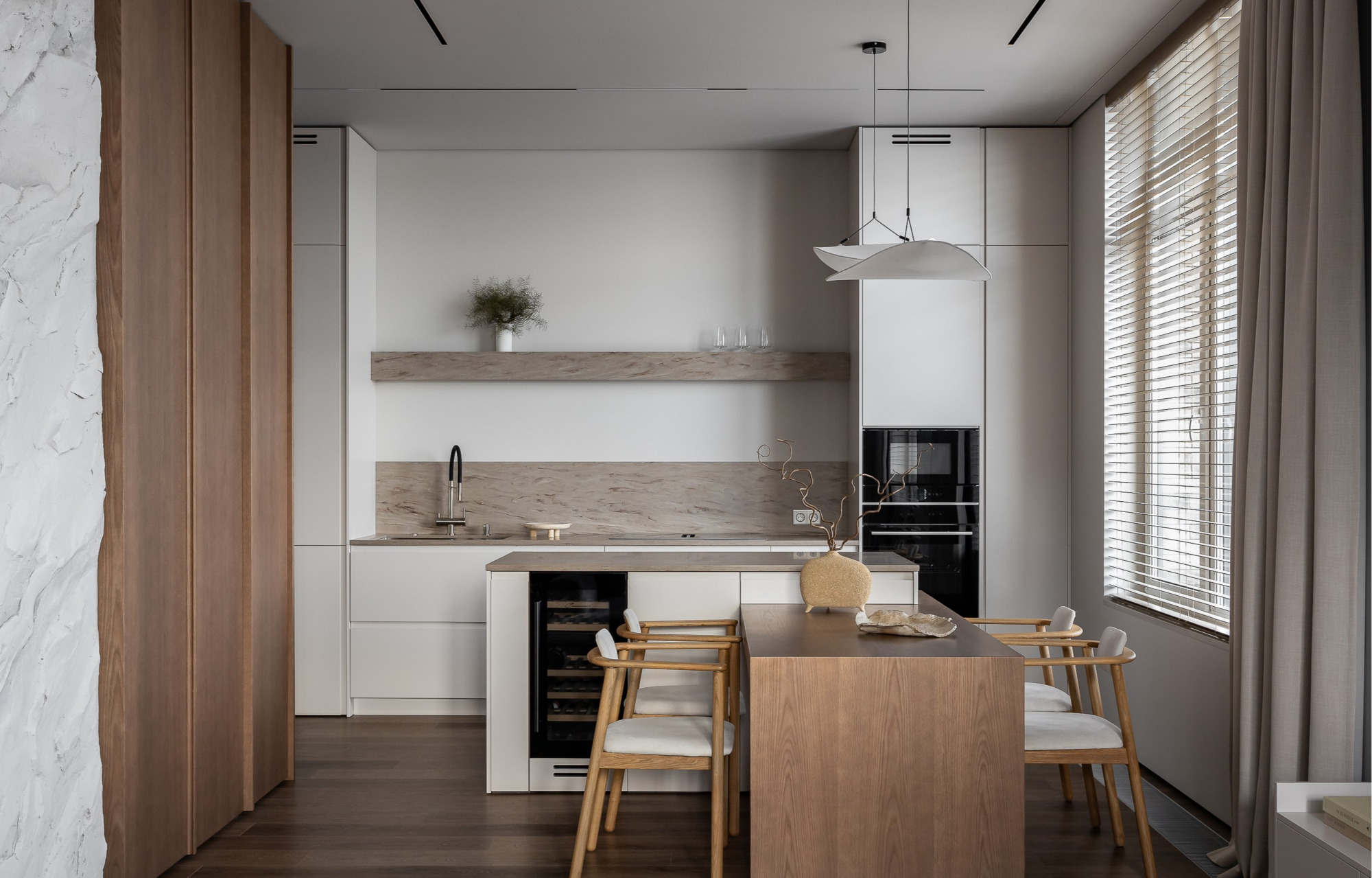 Кухонный гарнитур выполнен на заказ. Среди нестандартных решений можно отметить варочную панель со встроенной функцией вытяжки и отказ от верхних шкафов. Фасады изготовлены из МДФ, покрытого эмалью в цвет стен, с интегрированными ручками. Столешница, полка и фартук выполнены из искусственного камня. Этот же материал использован и для острова, который плавно переходит в обеденную зону. Со стороны гостиной в остров встроен винный шкаф.