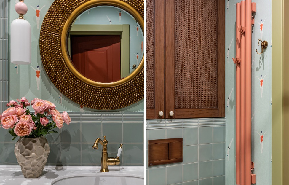На полу уложили керамогранит с геометричным узором в виде звезд, который перекликается с винтажной эстетикой. Ванну установили стандартную белую, закрыв ее розовой шторкой на латунном карнизе. Благодаря сочетанию мятной плитки ручной работы, влагостойких обоев с пловчихами, розовых акцентов и латунных деталей санузел превратился в яркое средиземноморское пространство с характером.