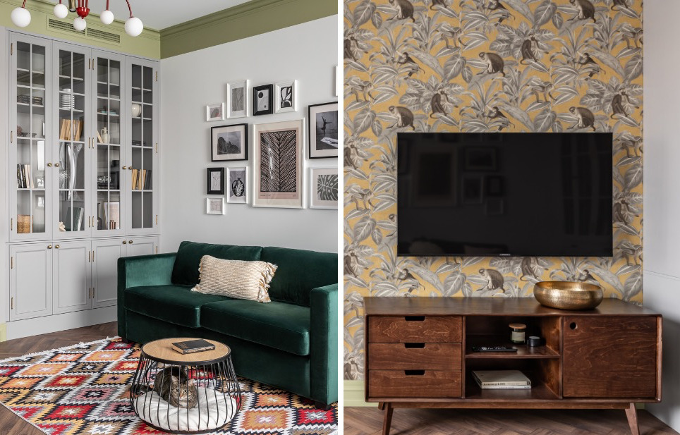 В гостиной разместили буфет в стиле мебели 60-х годов — его долго искали, чтобы не заказывать дорогое индивидуальное производство. Нашли местного производителя с разумными ценами и высоким качеством. Буфет с полками и застекленными секциями стал местом для размещения книг, сувениров из путешествий и декоративных предметов,