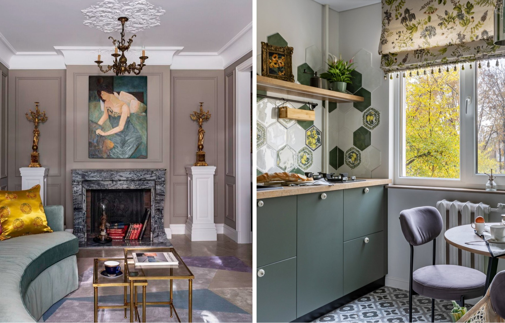 Интерьер выполнен в серой гамме с классическими элементами и современными акцентами, включая каминный портал XIX века, привезенный из Франции, который стал смысловым центром гостиной. Концепция «шкатулки» помогла создать камерную обстановку с театральными нотами, где антикварные предметы служат декором и формируют уникальное настроение и атмосферу. В квартире продумана система хранения, создающая ощущение «взрослого» пространства без визуального шума.