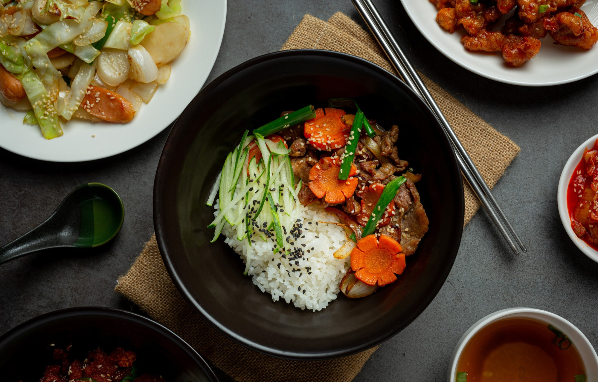 Корейская еда подается в множестве маленьких тарелочек: рис отдельно, суп отдельно, основное блюдо отдельно, закуски отдельно. Это не только красиво, но и функционально.